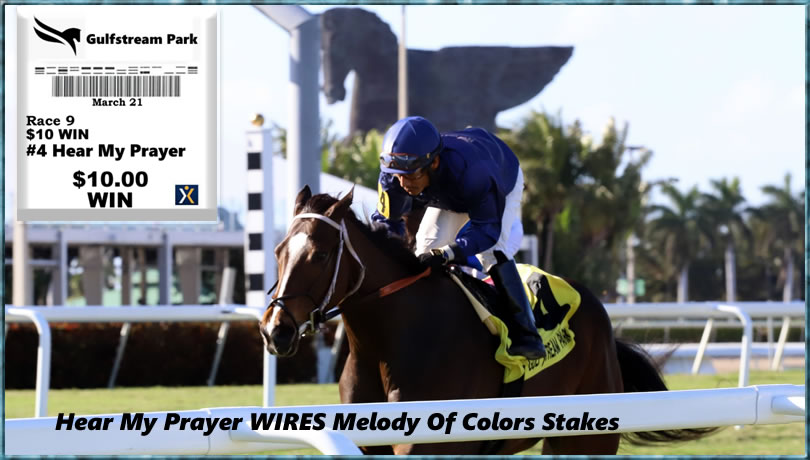 So now, after back-to-back 50% winning days I really had to wonder what kind of day today would bring. I used for the banner the photo of Kim and I from the Florida Derby two years ago when I picked SEVEN winners on the card including the Derby winner, Audible. It's easy to say afterwards, but I SHOULD have known. Todd Pletcher wins with so many of his 3yo, and while his numbers haven't been as great this year STILL "the rule" is to always go with the Pletcher 3yo. But on some rare occasions I find a horse that I'm willing to take the risk on bypassing the price available on the Pletcher runner. In the opener EVERYONE knew Counterstrike was the one to beat and was sent off at 3/5. 8th while the Pletcher colt won at 5/1. Wow. But I came back to win the second with Miz Chaplain. She'd been a runaway winner in a maiden claimer at GPW and was claimed by Saffie Joseph. He was unbeatable with that move until the calendar turned to March and now he's just "very good with" those. He'd given the filly three long months to bounce back and had seen her work bullets in the morning. Sent right to the front she was the easiest kind of winner in a 3yo claiming event sprinting six furlongs.