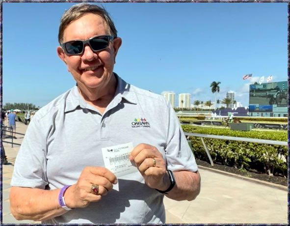 Ran close seconds in two of the next four (with a third and a fifth) before it was time for the Gulfstream feature, the Gulfstream Park Sprint - a $125K race at six panels. I had found it interesting that on the "Gulfstream Today" show on Thursday, during the "Lightning Round" the GP analysts had previewed this key event and BOTH had said "NOBODY beats Candy Man Rocket on Saturday." So when I opened the past performances I expected him to leap off the page as the "obvious" short priced winner. But this was NOT the case. He DID look like the winner, but far from a hands down type. But when the betting opened and he was taking a LOT of money, and was a short priced pick in all the multi-race payoffs I upped the bet and made HIM the "BET of the Day" for today. The front runner burst out of the gate and was at least half a dozen clear heading into the far turn. My rider was sitting chilly in third and I wondered if he was waiting too long. Then he shook the reins and the response was immediate. By the time they were spinning out of the turn and turning for home I was inhaling the front runner and had not even been asked for my best. Ran off as easily the winner. And in spite of all the early money, somehow the crown let him slip up to 7/5 and I cashed for almost $50 on my BEST of the day. WHOOOO HOOOOO - obviously time for another "winning ticket photo op!"