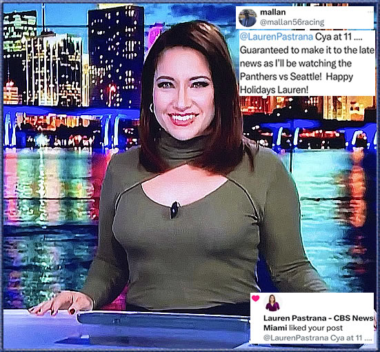 I had contact with gal-pal Lauren Pastrana multiple times this week. First when letting her know because of the late Panthers games I'd be up late for the 11 pm news. Then late in the week the CBS Miami team was NOT on the air. I reached out to her and she answered almost immediately - that's my girl! Then I let her know how appreciative I was to see her and the team and she replied and re-posted the pic. Finally she reacted to my news about heading out on the Christmas Cruise.