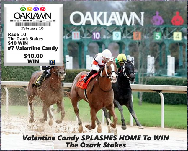 Missed at Tampa when second with a "prime time" play on the turf before closing out the day when Valentine Candy won his third sprint stakes for 3yo at Oaklawn in their featured Ozark Stakes. I finished the day 13-for-26, an EXCELLENT 50% win average. For the day I lost a little over $8 - and I was ok with that considering I'd had two "BIG" bets (for a combined $50) and lost them both.